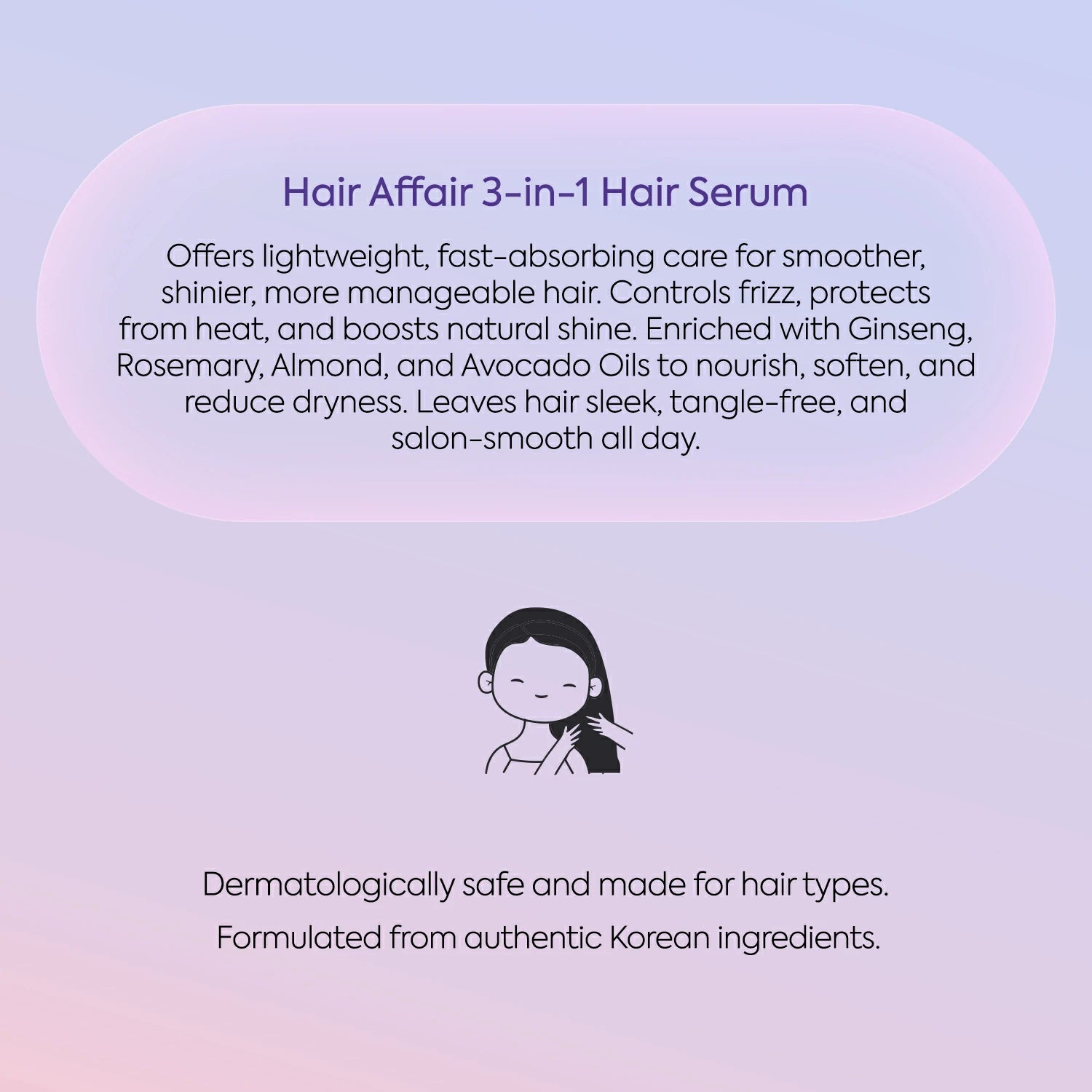 Meet Hair Affair 3-in-1 Hair Serum - your all-in-one solution for frizz control, heat protection, and mirror-like shine. Made for Indian hair, this lightweight, silky serum detangles effortlessly, tames unruly strands, smoothens frizz, and adds a natural, glossy finish. Powered with Korean Ginseng Extract, Rosemary Leaf Oil, and Sweet Almond Oil, Hair Affair keeps your hair manageable, polished, and photo-ready every single day. Perfect for straight, wavy, curly - all hair types.